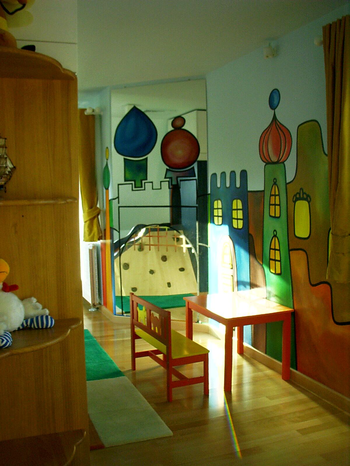 A gyerekek előszeretettel firkálják össze az üres falakat, de itt erről szó sincs, hiszen egy ügyes dekorfestő az én ötletem alapján jópofa dekorációt varázsolt nekik, a végén színtelen lakkal átkente a felületet, ezért le is lehet törölni, ha összemaszatolódna a műalkotás. A rajzhoz külön asztalkánál van lehetőségük.